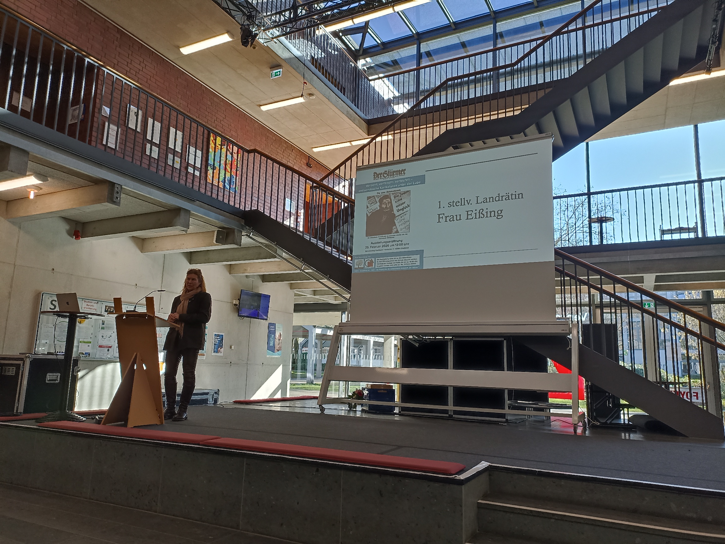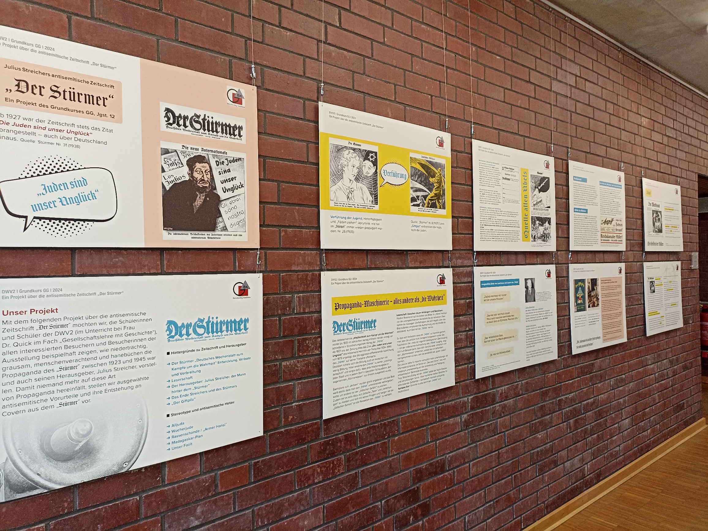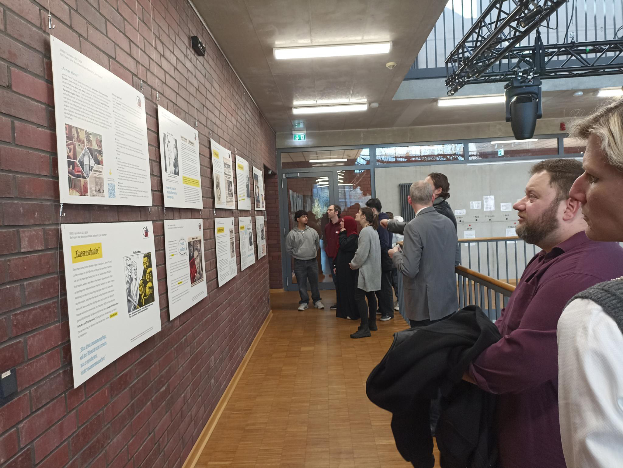 Im Berufskolleg selbst wurde zudem die Ausstellung „Verzerrt, verfälscht, verteufelt – antisemitische Karikaturen unter der Lupe“ zum antisemitischen Hetzblatt „Der Stürmer“ ausgerichtet. Die Ausstellung beschäftigt sich mit der Frage, wie antisemitische Propaganda funktioniert hat und bis heute wirkt und steht als Wanderausstellung auch anderen Schulen zur Verfügung. Als besonderer Gast besuchte der 1. Stellvertretende Bürgermeister von Gladbeck, Peter Rademacher, die Ausstellung und überbrachte Grüße der Stadt. Bei der Eröffnung der Ausstellung richteten auch Holger Pleines, Schulleiter des Berufskollegs, sowie die Lehrerinnen Dr. Rebecca Quick und Gerda Koch, die Landtagsabgeordnete Christin Siebel und die stellvertretende Landrätin des Kreises Recklinghausen, Martina Eißing, das Wort an die versammelten Gäste.